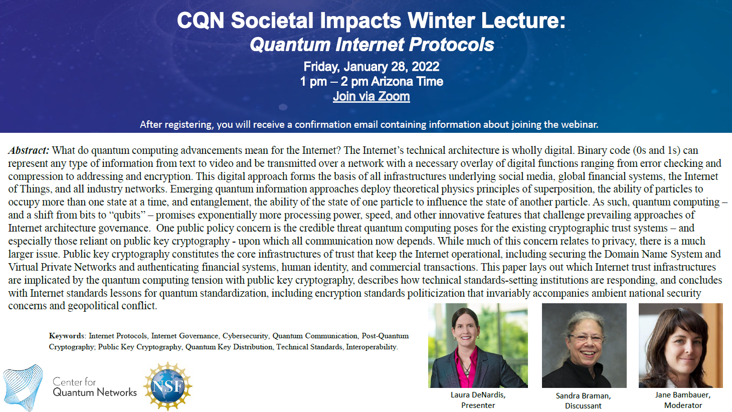 Join us on Friday (January 28) at 3 p.m. ET as our Co-Director Dr. Laura DeNardis presents cutting-edge research about Quantum Internet Protocols at the Center for Quantum Networks (CQN) Societal Impacts Winter Lecture. She will be joined by discussant Dr. Sandra Braman, Abbott Professor of Liberal Arts at Texas A&M University, and moderator Dr. Jane Bambauer, Professor of Law at the University of Arizona.